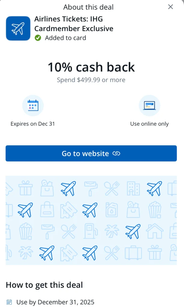 Chase 优惠(仅限 IHG):消费满 499.99 美元以上,机票消费可享 10% 返现