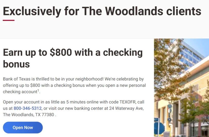德克萨斯银行推出优惠活动,开设新支票账户并完成以下要求,即可获得 400 美元/800 美元奖励
