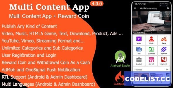 Multi Content App + Reward Coin is a content management system which run under Android platform that used for your own Video (mkv, streamin m3u8, TV channel, youtube, vimeo. voice, ...), Music, HTML5 Games, Text, Article, News, Direct URL, Download Files, Product, Catalog, Ads, Buy Sell, City Gide and support from Android 4.2 and higher. With powerful and Responsive Admin Panel can manage unlimited category and sub category and publish any content. This application created by Android Studio for client side and then PHP MySQLi (Codeigniter) for Admin side. Run under Android platform which is the most popular operating system in the world. Using this application you can save your money and time in creating application for your own any content Application.Demo: https://codecanyon.net/item/multi-content-app/23492231 https://www22.zippyshare.com/v/Hc5Oi90h/file.htmlhttp://ul.to/l7iqv2eyhttps://novafile.com/91s2i7kzyrq2https://nippyshare.com/v/88a0b7https://www.mirrored.to/files/ASWQHXCB/ View the full article