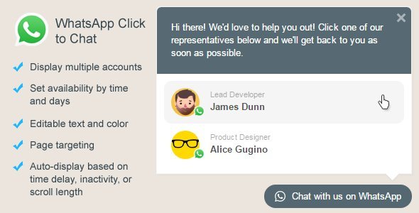 This WordPress WhatsApp plugin is a simple tool to show your team’s accounts in one box. It displays a list of WhatsApp accounts on your site which when clicked, will take the user to that particular account on https://web.whatsapp.com/ if the user is using a desktop, or open the WhatsApp application if she is on a mobile device.Demo: https://codecanyon.net/item/whatsapp-click-to-chat-for-wordpress/20248537 https://workupload.com/file/dcm4V8HTqNFhttps://userscloud.com/clidgbxdeqa2https://www.upload.ee/files/15687644/whatsappclicktochat-2212.rar.htmlhttps://pixeldrain.com/u/14CPoYChhttps://nippyspace.com/v/50432fhttps://www.mirrored.to/files/AFBOET5V/whatsappclicktochat-2212.rar_linkshttps://mirrorace.org/m/7gJxZhttps://krakenfiles.com/view/zs34U7aEQC/file.htmlhttps://hxfile.co/p827tlt0ltd2https://gofile.io/d/PeQPzdhttps://desiupload.co/ldpbp5j6c6jahttps://ddownload.com/wsbpa6jgtkdkhttps://dbree.me/v/32ff29https://1fichier.com/?b1rhq79698f3xvozy7q6 View the full article