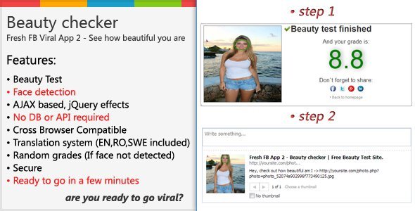 “Beauty checker” it`s a fresh and unique script on CodeCanyon which allows your users to perform free beauty tests. It works in a simple manner, the user uploads a picture with himself, where the face is visible, the picture it`s uploaded with a cool AJAX uploader, then it returns the a grade based on different aspects of his face, then, using the built in sharing plugin, he can share the result on Facebook, Twitter, Google Plus or LinkedIn. The script has no special requirements.Demo: http://codecanyon.net/item/fresh-facebook-viral-app-2-beauty-checker/5340119 http://hfiles.ro/download/fbbeauty.rar/1524135http://www.mirrorcreator.com/files/1XRBNPPJ/fbbeauty.rar_linkshttp://ul.to/xxcoic95http://www45.zippyshare.com/v/Iy6t3NDo/file.htmlhttps://www.solidfiles.com/v/p33YNByX8g5GGhttps://userscloud.com/9pipjatlcuxbhttp://www.megamirror.net/wkdmzdris7gyhttps://www.sendspace.com/file/i8oa3phttp://www.mediafire.com/download/6fs3cr6v22fccs5/fbbeauty.rar View the full article