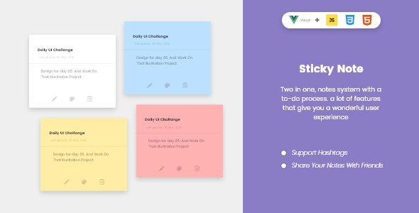 “Sticky To-Do Notes” is built with VueJS Technology which makes it very fast and easy to use and edit, you can write down your notes very easy, Edit them & delete them. It supports hashtags to link your notes that are on one topic or related to the same subject you can also include it in your project, by following the simple steps in the documentation it also supports sharing notes, by pressing the link icon it will put a link in your clipboard to share it with your friends. It uses localStorageDemo: https://codecanyon.net/item/sticky-todo-notes/22633894 https://www18.zippyshare.com/v/eK70C3wH/file.htmlhttp://userscloud.com/a6avqukr0n32http://ul.to/e776jgxmhttp://uploadboy.me/msd8hse7ewm1/stickynotes.rar.htmlhttps://www.sendspace.com/file/36e02phttps://sendit.cloud/njjcj94gqqklhttps://oload.stream/f/rvcoO-5ygSI/stickynotes.rarhttps://www.mirrored.to/files/1RKCQRRI/stickynotes.rar_linkshttp://www.mediafire.com/?26l7ox1h0q7e36ehttps://www.file-upload.com/7swecqha3bl1https://www.datafi