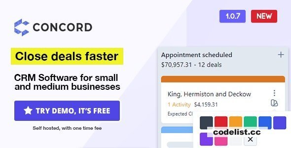 Concord is an affordable self-hosted CRM web-based application, with a one-time fee and can help your company to easily manage and organize deals/leads, contacts, and companies, and have a clear overview of the next actions that need to be taken to successfully close a sale.Demo: https://codecanyon.net/item/concord-deals-management-crm/38040332 https://www63.zippyshare.com/v/L9P0bxj9/file.htmlhttp://ul.to/q7p522dthttps://www.mirrored.to/files/GGWX5JS9/concorddeals-107.rar_linkshttps://mirrorace.org/m/1MQyrhttps://krakenfiles.com/view/ECjqAGWE8r/file.htmlhttps://hxfile.co/a93mzjoxv9l2https://gofile.io/d/1ZNnCmhttps://www.fireload.com/5004375295b1a3b2/concorddeals-107.rarhttps://www.europeup.com/i1uau89ws7tbhttps://drop.download/aavw0it5btil/concorddeals-107.rarhttps://dl1.desiupload.to/f2s65p0lexl0https://ddownload.com/arqbeffaeopyhttps://bayfiles.com/6akbg480ychttps://anonfiles.com/80kdg688yfhttps://1fichier.com/?jz6ciow1xc32e8h6aakx