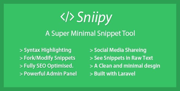 Sniipy is a super minimal snippet tool for code and text sharing. One can also fork or modify an already present snippet to make a new version of the original snippet. It also lets you share snippets on different social media sites. You can also see the snippet text in plain text if ever needed.Demo: https://codecanyon.net/item/sniipy-a-super-minimal-snippet-tool/7024301 https://www101.zippyshare.com/v/4C4Cjv4N/file.htmlhttp://userscloud.com/nwcrwe1lo4n8http://ul.to/dr36te8ehttp://uploadboy.me/1khxesjdl3ff/sniipy.rar.htmlhttps://www.sendspace.com/file/wftphghttps://sendit.cloud/f12s4mfq35cohttps://oload.stream/f/NB3Xx__qgDs/sniipy.rarhttps://www.mirrored.to/files/XOZB4LBB/sniipy.rar_linkshttp://www.mediafire.com/?crrg282802n0znihttps://www.file-upload.com/dhmxwwmxgf85https://www.datafilehost.com/d/8f63f10ahttps://dailyuploads.net/k4rqj7ywibxf