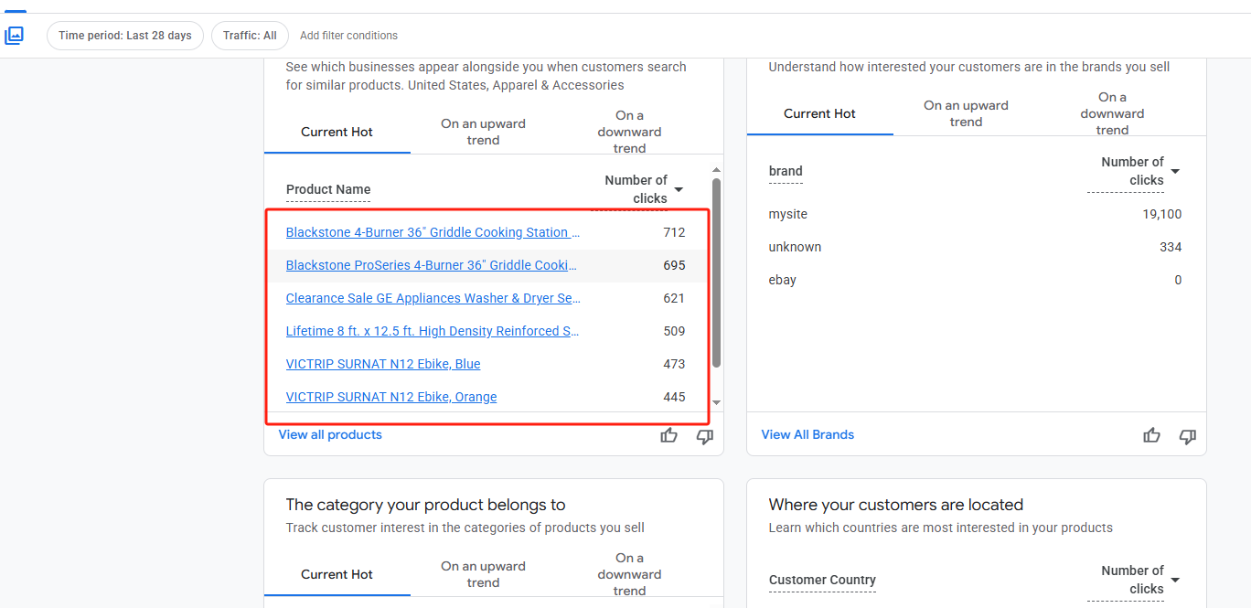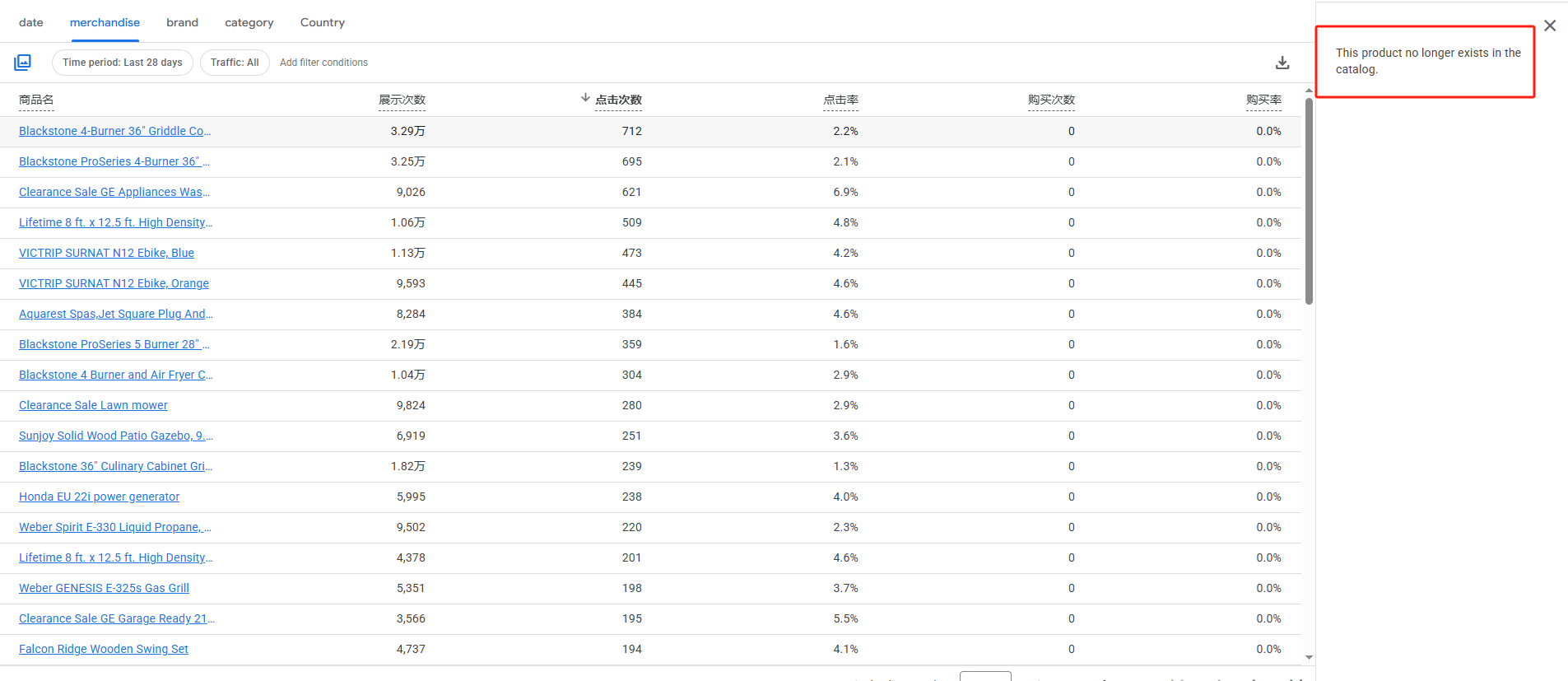 Next, let’s look at the product clicks. These are the products they deleted because they did not authorize the ads account to me. I cannot see the ads information.