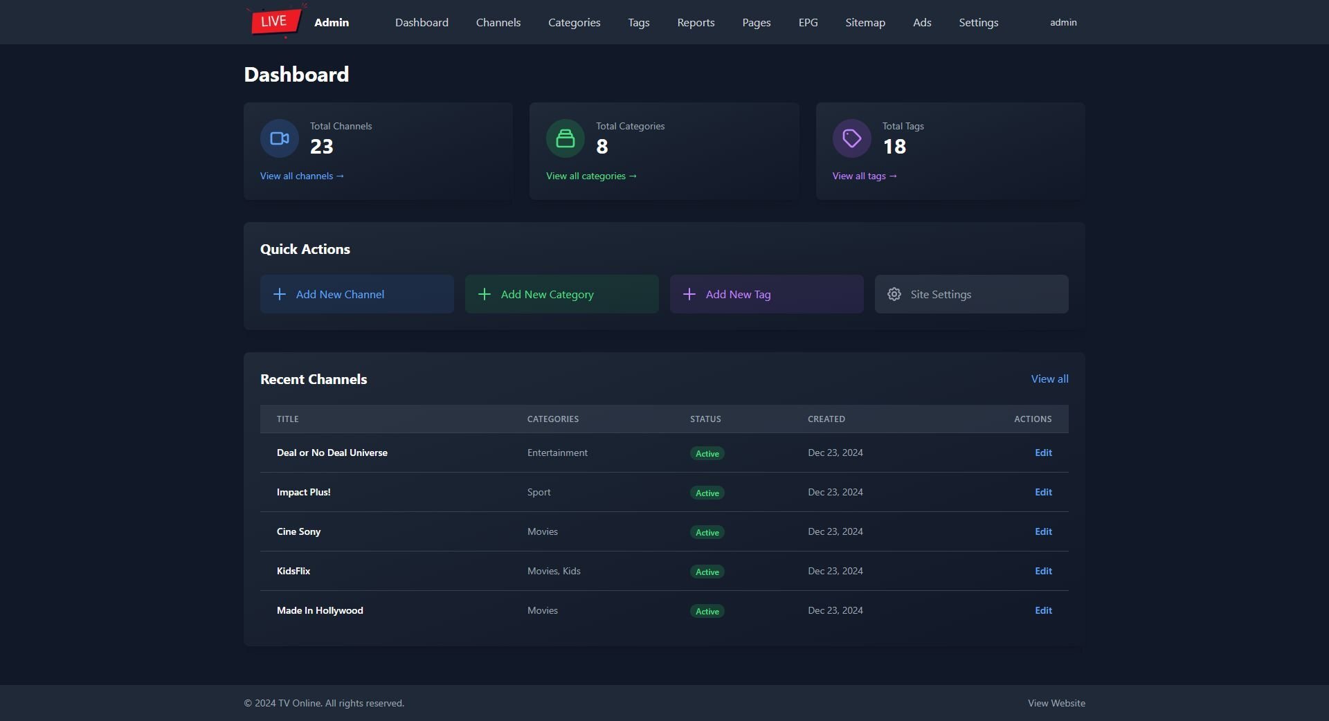TV Directory is a comprehensive TV channel management platform designed to help users create and manage their own streaming services. With an integrated Electronic Program Guide (EPG) and a full-featured admin dashboard, TV Directory offers a seamless experience for viewers and administrators alike. From managing channels to tracking viewer preferences and reports, this platform is the perfect solution for building your own IPTV service.