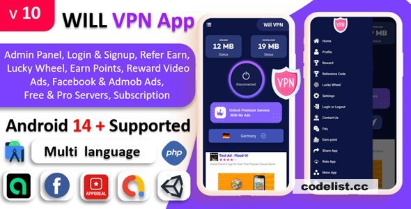 Will VPN is very fast and secure VPN app with unlimited bandwidth and it’s have lot of secure servers in this VPN app when you can Scroll down the Servers You can See more & more servers. In this VPN app you can connect any country server on only one click. And in this app You can add Unlimited servers. And In this have Powerful Back-end for manage All things, Like Users, Notification, Servers, Ads, Reward Points, Lucky Wheel and etc. Now you can easily unblock those geo-restricted websites and gain access. In this app have Reward Video Ads For Unlock Premium Servers. You will get the Revenue By Subscription & Reward Video ads, Interstitial ads, Banner ads. We have Integrated Facebook Ads, Unity Ads, Appodeal Ads and Admob Ads.Demo: https://codecanyon.net/item/will-vpn-app-vpn-app-with-admin-panel-secure-vpn-fast-vpn-refer-earn-reward-lucky-wheel/31674741 https://workupload.com/file/yJxDUh5qBuDhttps://www.upload.ee/files/18509808/willvpn-110.rar.htmlhttps://pixeldrain.com/u/CVXejw32