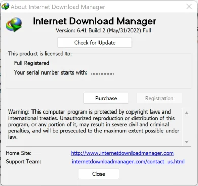 替代解决方案 – (不推荐) 请注意,如果“手动破解”不起作用,那么您可以使用提供的修补程序来激活 IDM 产品许可证。 如果您不熟悉破解,您可以随时使用下面提供的 IDM 序列号。(但这种方法有一个缺点)您必须在每次启动 PC 时应用序列号。 无论如何,让我们开始吧: 安装“最新”互联网下载管理器试用版后。 导航至“程序”的注册选项卡 “暂时”关闭您的互联网连接。 之后填写名字、姓氏和电子邮件地址字段。(包含任何虚假信息)。 输入下面提供的任何互联网下载管理器序列号来激活该程序(忽略错误)程序可能会自动关闭,因此如果是这种情况,请重新启动它。